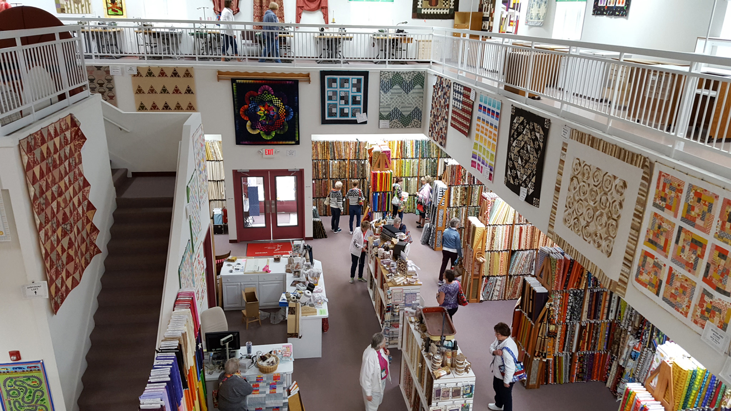 Inside the glass case, a rolled quilt shows the backing and the top.